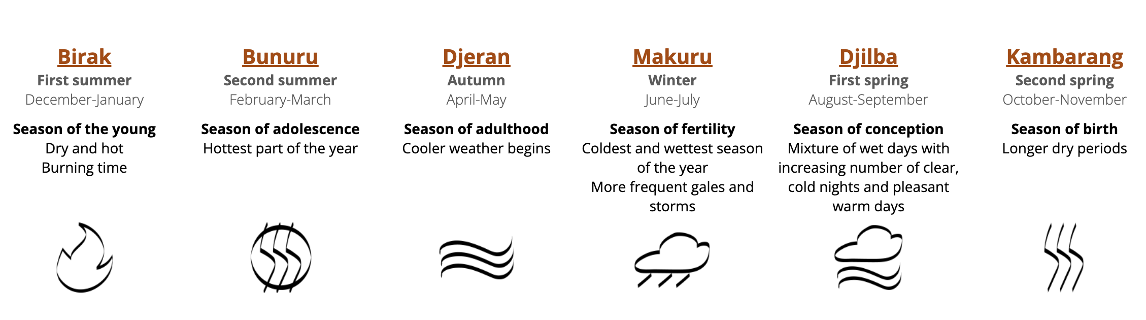 Each year brings a variable flowering of native ground covers, shrubs and trees. Wildflowers like orchids and trigger plants blossum in the Nyoongar Djilba season. This is followed in Kambarang by Jarrah flowering. The Jarrah flowering usually overlaps with Banksia flowering in Birak. Finally, Marri flowers during Bunuru. Very little flowers in Djeran and Makuru in the native forest.