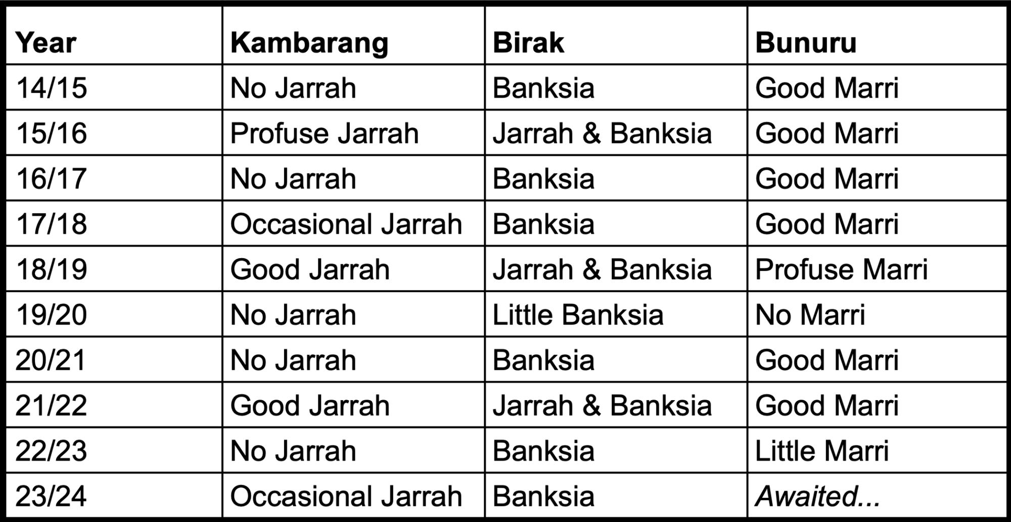 A characteristic of the Jarrah (Eucalyptus marginata) and to some extent the Marri (Corymbia calophylla) is that they tend not to flower much (if at all) after a year of profuse flowering. Below is a log I update across the warmer months when the honey flows, noting the flowering from year to year near my hives. Good rain in the preceding season leads to better flowering. The 19/20 season was preceded by a very dry Djilba. Very little honey flowed at all - either near me or across southern Australia in general across the warm 19/20 seasons.
